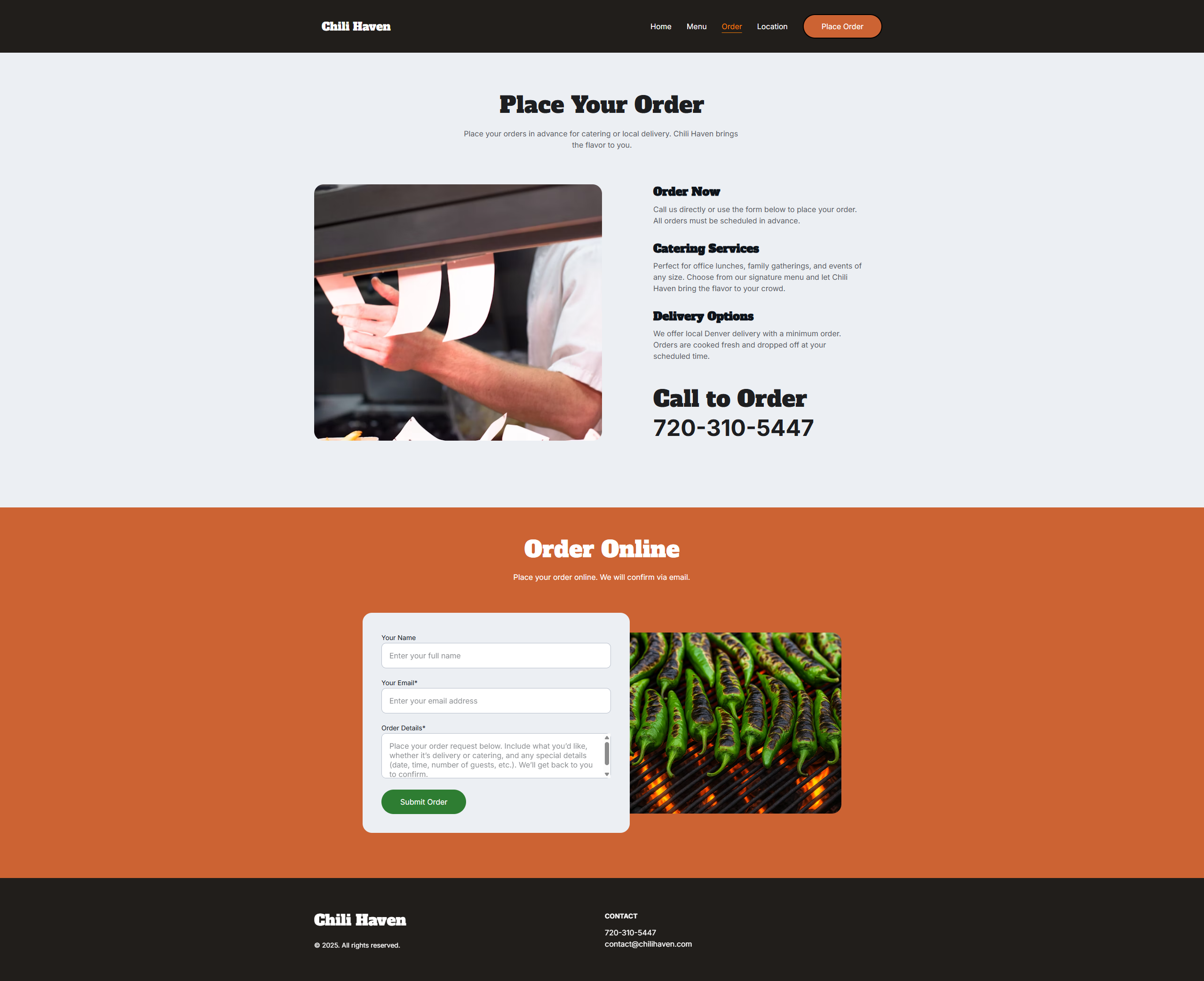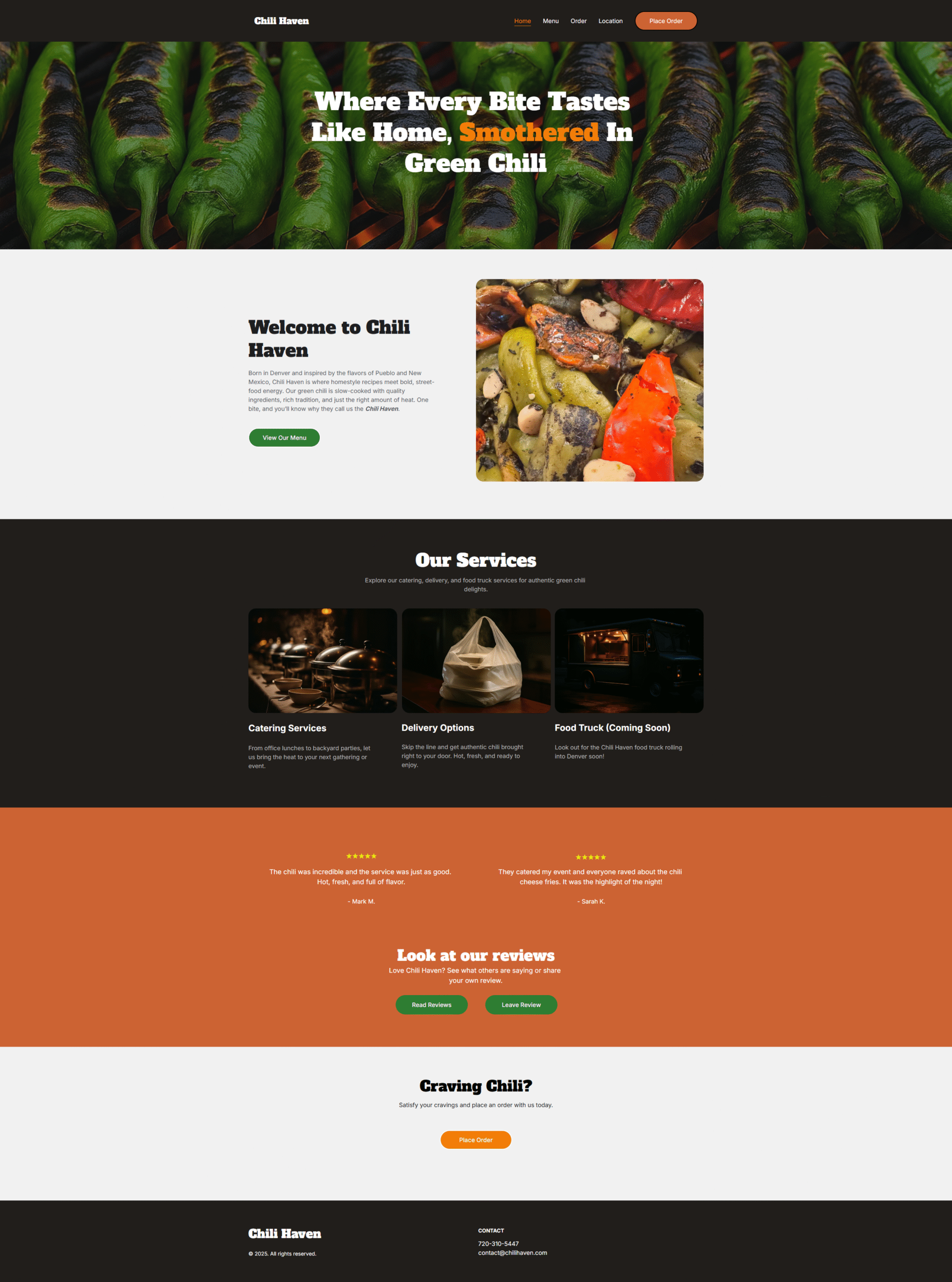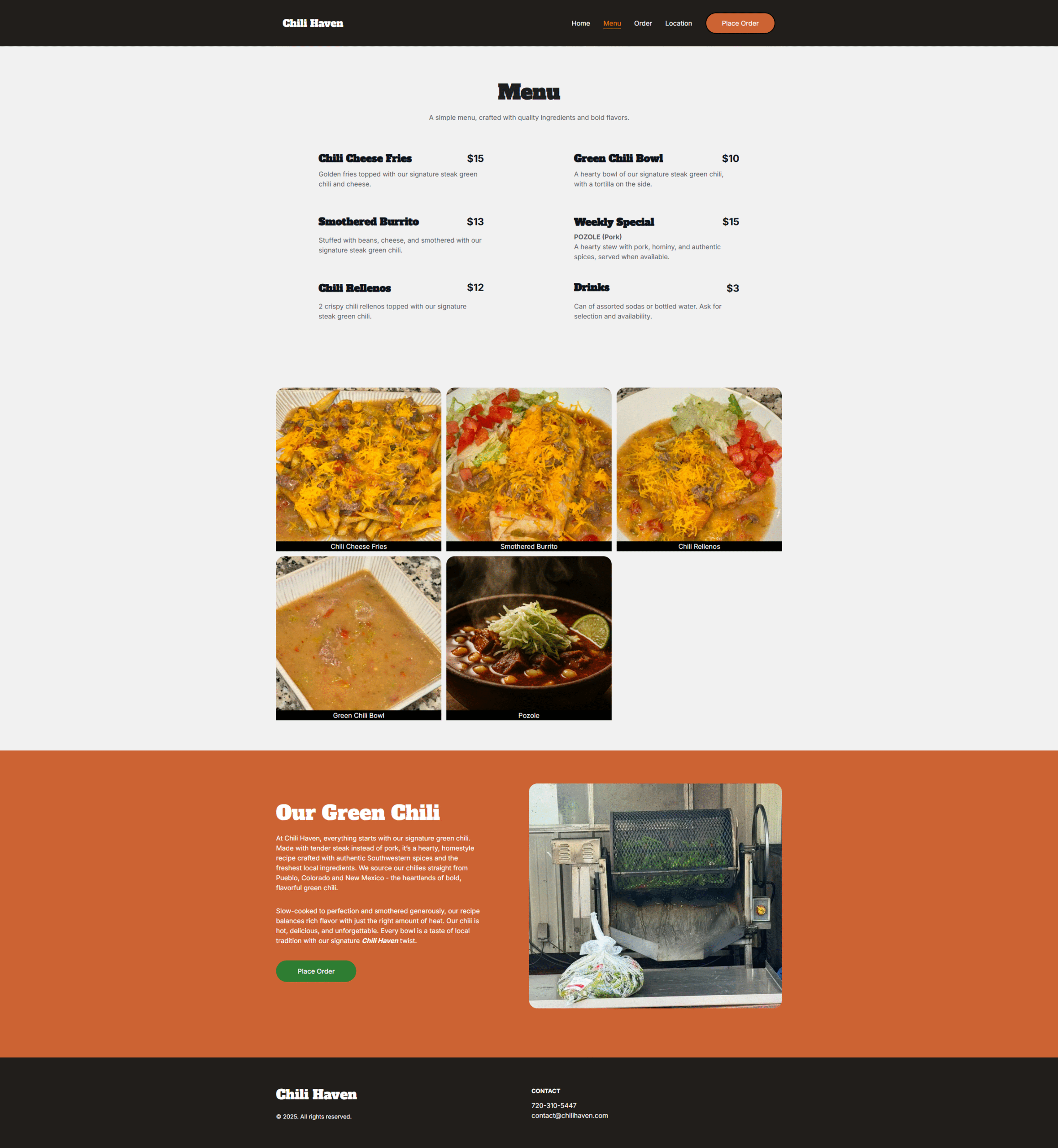 I handled the complete business setup process, assisting with LLC registration and establishing their backend systems. This included setting up a full Google ecosystem – custom business emails, domain configuration, Google Analytics, Search Console, and a verified Google Business Profile. For the website, I designed and built a clean 4-page site in the Hostinger web builder, using Hostinger for both hosting and domain management. The site was designed around user flow, making it easy to navigate, and showcased Chili Haven’s brand message of authentic, local Colorado green chili.